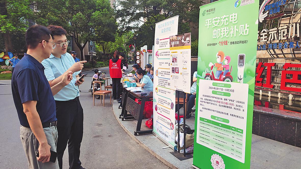夏深秋淺,走進江蘇省宿遷市鳳凰美地小區(qū),單元樓下嶄新的電動自行車停車棚非常醒目,棚內(nèi)設(shè)有充電樁與多處充電插孔,居民的電動自行車整齊排成一列充電。“在微信上綁定郵政儲蓄卡,只需支付1分錢,就可以給電動車充滿電了,既方便又實惠?!毕硎艿洁]政便捷又優(yōu)惠的支付服務(wù),小區(qū)居民張大姐開心不已。
