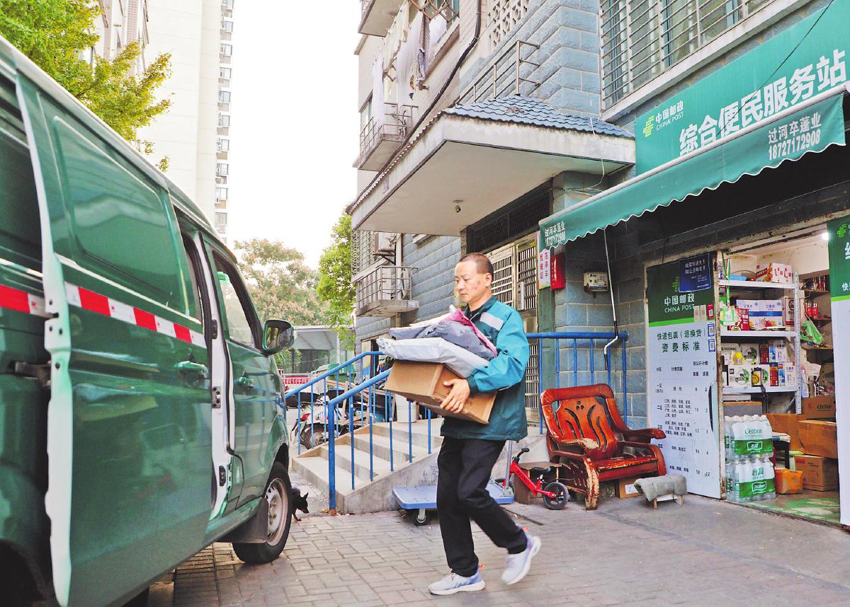 攬投員在綜合便民服務(wù)站攬收通過(guò)“寄件寶”收寄的郵件。□宋陽(yáng) 攝