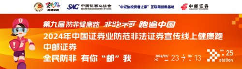 為進(jìn)一步加大防范非法證券活動(dòng)正面宣傳力度,更加有效地保護(hù)投資者合法權(quán)益,倡導(dǎo)全民健康生活方式,履行證券行業(yè)社會(huì)責(zé)任,在中國(guó)證券業(yè)協(xié)會(huì)、中國(guó)田徑協(xié)會(huì)、中國(guó)證監(jiān)會(huì)陜西監(jiān)管局、中共陜西省委金融委員會(huì)辦公室、陜西證券期貨業(yè)協(xié)會(huì)等多家單位的指導(dǎo)下,中郵證券于2024年9月23日正式啟動(dòng)“2024年中國(guó)證券業(yè)防范非法證券宣傳線上健康跑”第二十五站公益活動(dòng),歷時(shí)21天,于10月13日?qǐng)A滿收官。