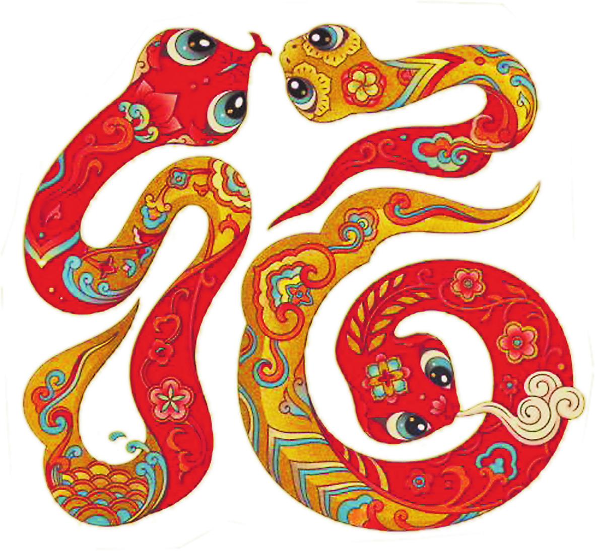 在生肖動物里,蛇的設(shè)計難度是比較大的。蛇的形象具有兩面性,它有著吉祥的象征寓意,外形卻又容易讓人產(chǎn)生畏懼感。那么,如何讓設(shè)計的蛇的形象能夠被大眾接受,是我這次創(chuàng)作面臨的主要挑戰(zhàn)。我希望塑造的蛇是對人親近的,是活潑可愛、圓潤豐滿的,所以就通過靈動的線條和姿態(tài)來表現(xiàn)其造型,在畫面上實現(xiàn)傳統(tǒng)與現(xiàn)代審美之間的平衡。