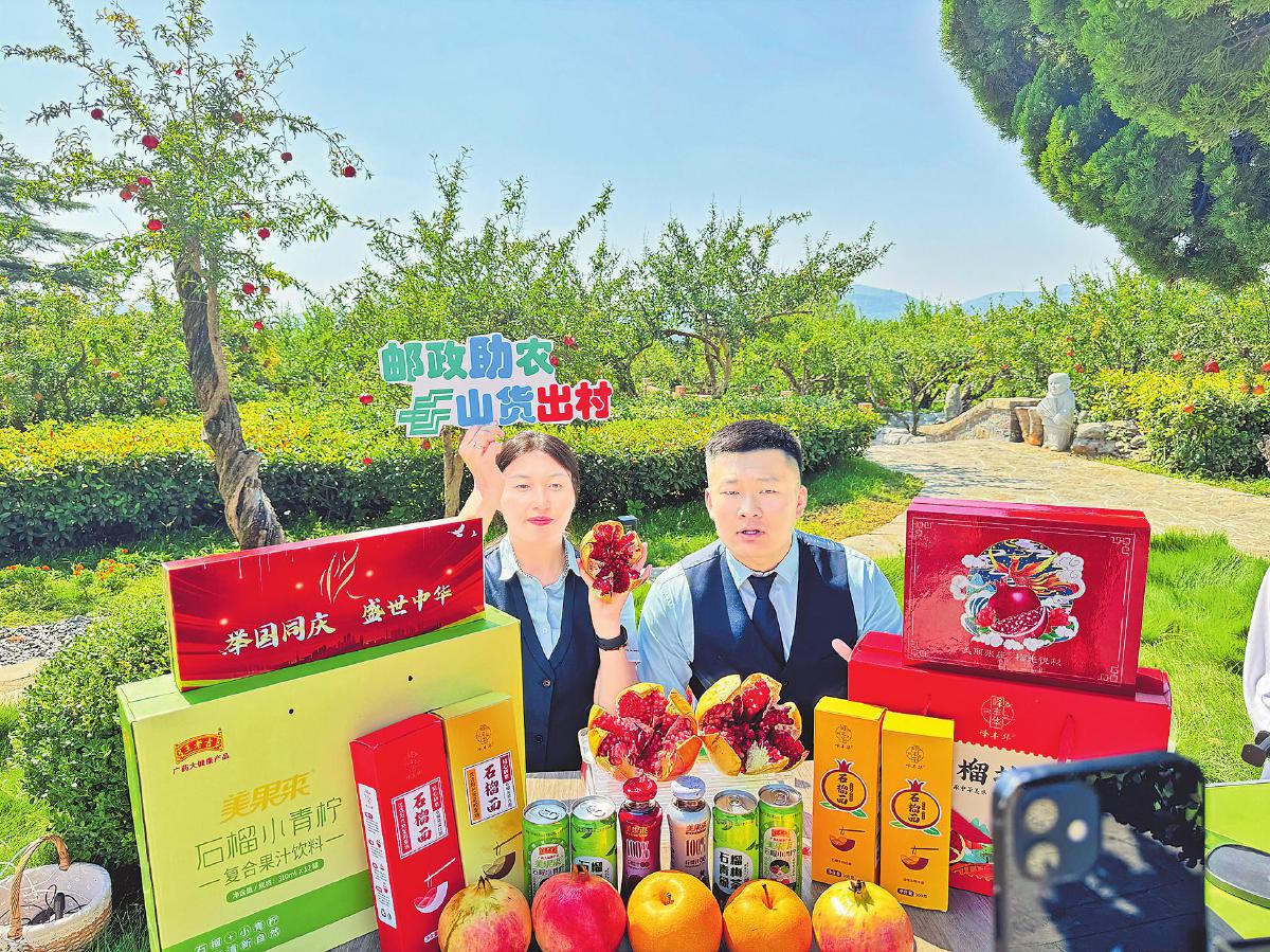 棗莊郵政在石榴園進行助農(nóng)直播。□程菲 攝