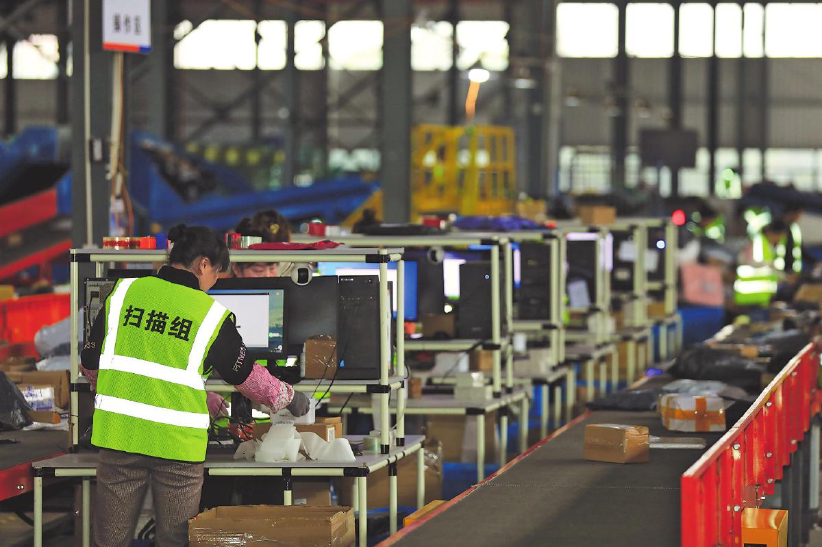 工作人員將入庫(kù)后的郵件逐件掃描換單,一件件貼上郵政面單的包裹將通過(guò)專(zhuān)車(chē)發(fā)往新疆。 □韓穎 攝
