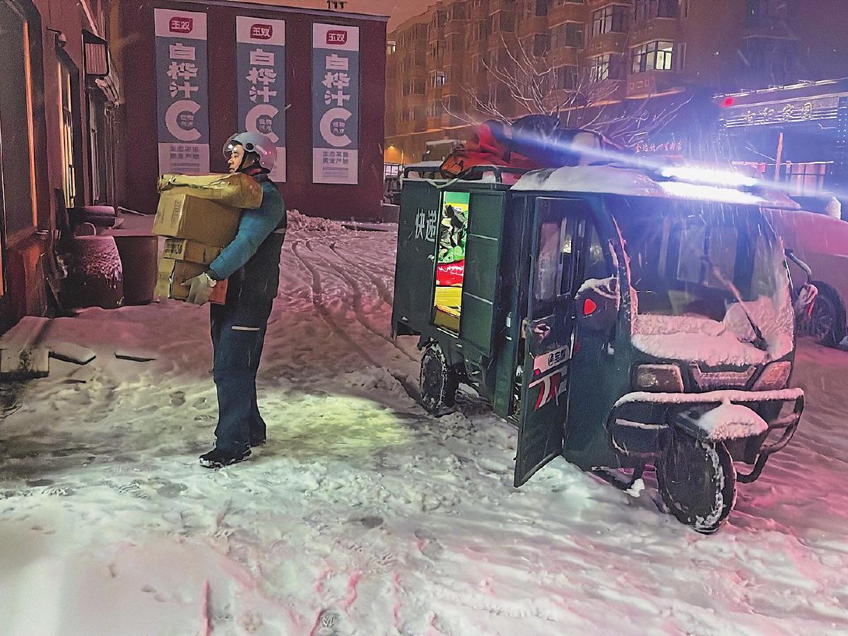 11月27日,黑龍江省雞西市突降大雪,路面被積雪覆蓋,車輛行駛困難。晚上8點(diǎn)多,雞東縣郵政分公司投遞員陳永廣冒著大雪來(lái)到石河北村投遞郵件??吹洁]政人堅(jiān)持第一時(shí)間投遞到戶,村民豎起了大拇指。