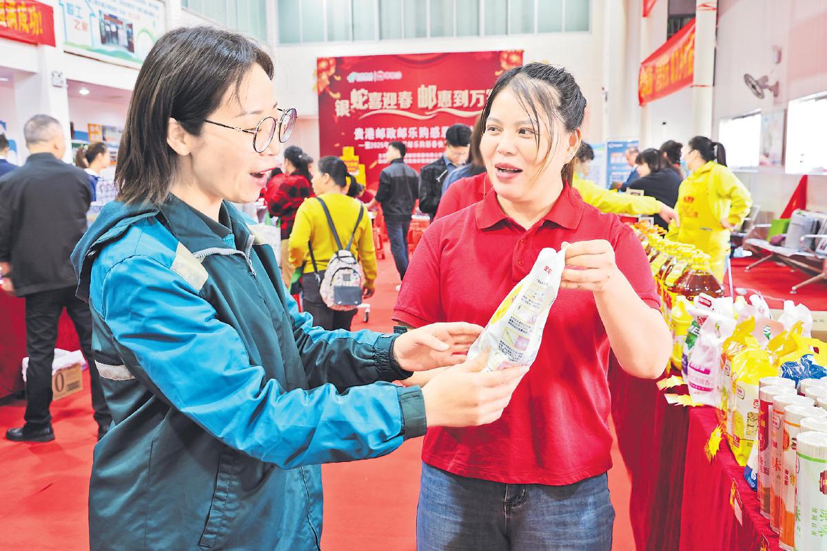 自12月以來,廣西壯族自治區(qū)貴港市郵政分公司在全市舉辦多場2025年郵樂購新春快消品展銷會(郵樂購感恩答謝會),約120家經(jīng)銷商、1200名客戶受邀參加。通過舉辦展銷訂貨會,貴港市分公司密切了與經(jīng)銷商的合作關(guān)系,提升了客戶的活躍度,為2025年發(fā)展優(yōu)質(zhì)客戶打下了基礎(chǔ)。展銷會通過現(xiàn)場選購、線上下單的方式,實現(xiàn)總訂貨額450萬元。圖為郵政工作人員在展銷會現(xiàn)場向客戶介紹商品。