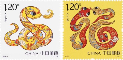 《乙巳年》特種郵票一套2枚,郵票圖案名稱分別為蛇呈豐稔、福納百祥。該套郵票以敦煌壁畫和傳統(tǒng)民俗為靈感來源,將蛇的形象與吉祥寓意巧妙結合,既體現(xiàn)了生肖文化的獨特魅力,又凝聚了樸素靈活的民間智慧。兩枚郵票不僅是對生肖之美的再次詮釋,更是對時和歲豐、福澤四季的深情祝福。郵票第一圖“蛇呈豐稔”,畫面提煉了中華傳統(tǒng)文化中盤蛇的靈動意象,加以喜慶裝飾應和年節(jié)氛圍。金色的蛇軀蜿蜒,口中銜著一束“嘉禾”,象征著“倉廩實,衣食足”的美好圖景。蛇身金光熠熠,與璀璨的麥穗交相輝映,仿佛繪就了一幅豐收時節(jié)金光燦爛、富饒滿溢的畫卷,寓意著風調雨順之年、五谷豐登之景,以及國泰民安的盛世祥和。郵票第二圖“福納百祥”,畫面以草書筆意將三條蛇創(chuàng)意性地構成了“福”的字形,簡練灑脫、柔美順通。兩大一小三條蛇之間情感細膩流動,顧盼生情,生動展現(xiàn)了闔家歡樂的溫馨場景,寓意著和合共生、福滿人間,寄托了人們對美好生活的無限追求與誠摯祈愿。該套郵票由北京郵票廠有限公司采用膠雕套印工藝印制,全套郵票面值為2.40元,計劃發(fā)行套票2680萬套、版式二162萬版、小本票387萬本。