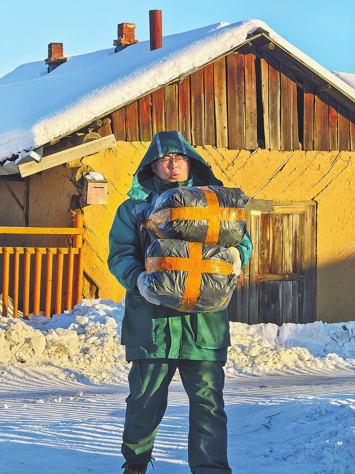 時下正是黑龍江省漠河市北極村的旅游高峰期,北極村內(nèi)“最北郵局”的投遞員王秀瓏也迎來了自己的投遞旺季。當?shù)囟練鉁氐停访嫔系谋┖茈y消融。為了將郵件盡快送達,他一般會選擇步行或者用小推車運送郵件。郵件投遞高峰期,王秀瓏忙得連飯都顧不上吃。但他說:“客戶早一點兒拿到郵件,我也早一點兒安心?!薄鯊埡閺姟z影報道