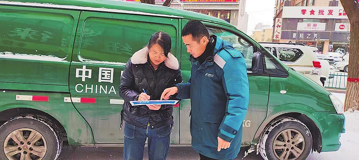 近日,陜西省榆林市定邊縣普降大雪,道路積雪結冰,給人們生活帶來諸多不便。而在各小區(qū)門口、社區(qū)門前都能看到郵政人忙碌的身影,他們一邊耐心地與客戶溝通,一邊迅速地卸下郵件,盡管被凍得手腳麻木,卻依然仔細核對每件郵件信息,確保郵件妥投,贏得了客戶的贊揚。□吳巧蓉 攝影報道