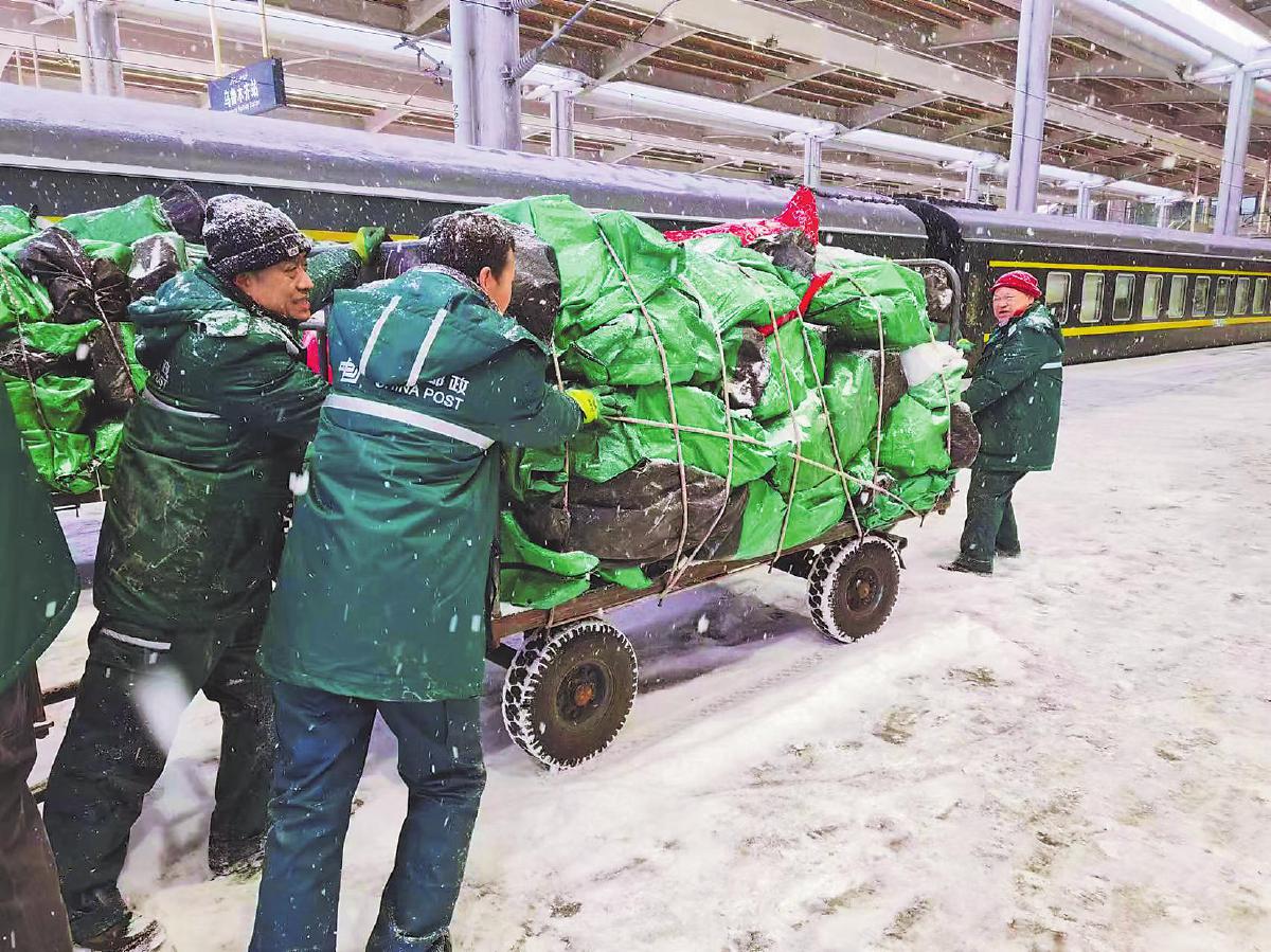 近日,新疆維吾爾自治區(qū)烏魯木齊市突降大雪,Z69次列車因此受阻,晚點半小時抵達烏魯木齊站。列車所掛郵政車廂裝載的400余件郵件急需轉運。轉運班組在僅有15分鐘的情況下,不畏嚴寒,緊密配合,按時完成了400余件郵件的卸車工作。□翟培 攝影報道