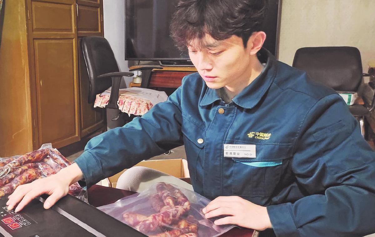 郵政工作人員為群眾郵寄的臘肉進行真空包裝?!跬跤罘z