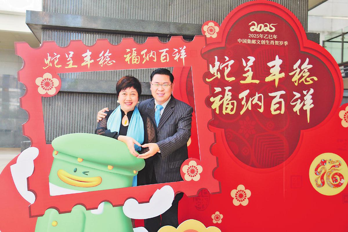 海南省郵政分公司聯(lián)合海南省博物館舉辦《乙巳年》特種郵票首發(fā)式。圖為郵迷在活動現(xiàn)場打卡留念?! 觞S文燕 李慧 攝