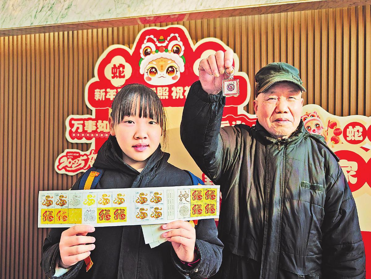 在江蘇省徐州市金山東路的郵票門市部,75歲的資深郵迷沈師傅帶著12歲的孫女最先買到了本命年生肖郵票,高興地向郵友展示其自制的第一輪蛇年生肖郵票鑰匙扣?! 踔x安吉 攝