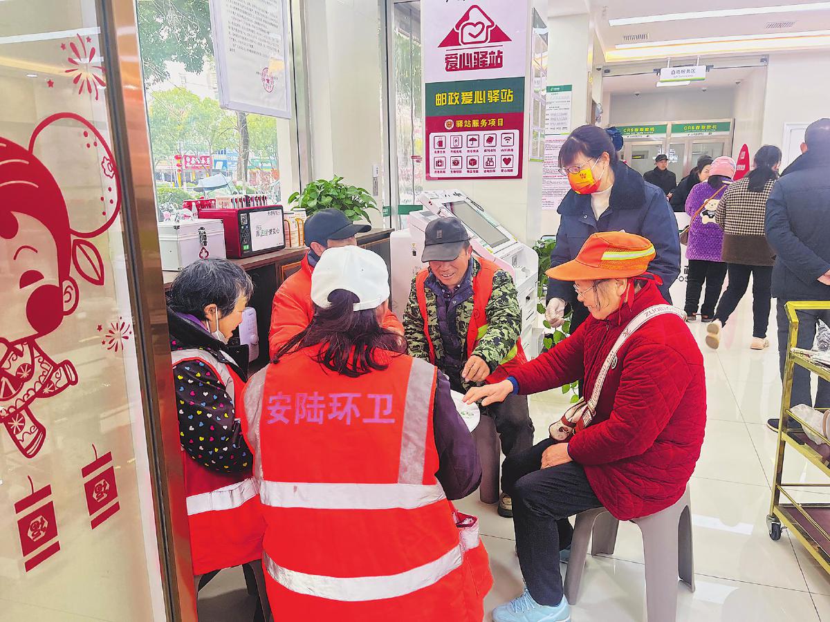 湖北省安陸市郵政分公司邀請戶外勞動工作者來到東城郵政支局“愛心驛站”共度“臘八”。環(huán)衛(wèi)師傅們圍坐在一起,喝著濃郁香糯的臘八粥,感受著郵政的愛心和溫暖。□包靜 攝影報道