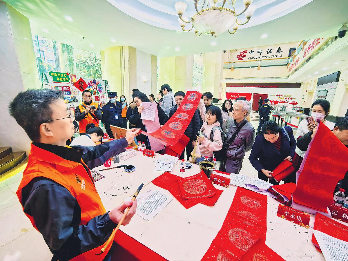 祥龍擺尾送舊歲,靈蛇獻瑞啟新春。臨近春節(jié),廣東省深圳市郵政分公司工會牽頭開展了“蛇來運轉 郵行千里 福送萬家”義寫春聯(lián)活動。在寶通大廈、福田濱海營業(yè)所、郵政大廈“職工之家”,特邀的書法家們在一張張喜慶的紅紙上揮毫潑墨,一副副春聯(lián)、一個個“?!弊周S然紙上,將飽含著的濃濃喜氣和美好的祝福傳遞給了基層員工和附近的社區(qū)居民。