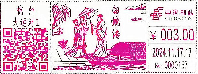 迎接乙巳蛇年,浙江省杭州市郵政分公司特別啟用“白蛇傳”郵資機(jī)宣傳戳一枚,繪制的是許仙為白娘子撐傘的動(dòng)人畫面。