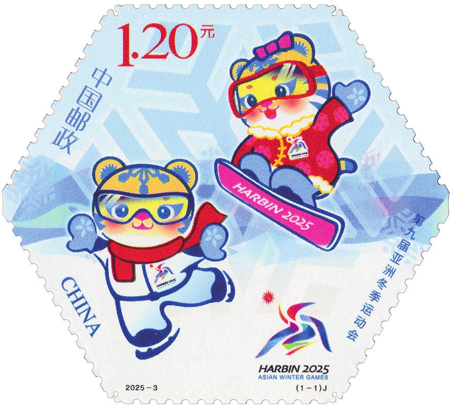 該套郵票采用六邊形票幅,以本屆亞冬會的吉祥物“濱濱”“妮妮”為畫面主體,輔之會徽及部分核心圖形加以表現(xiàn),畫面主題突出、構(gòu)圖簡約現(xiàn)代、色調(diào)純凈明快,充分展現(xiàn)出本屆亞冬會的鮮明特色。該套郵票采用高網(wǎng)線影寫版印刷工藝,以藍色為襯底基調(diào),配合特種珠光材料,增強背景視覺效果,豐富視覺層次。同時,輔以雪花形異型齒孔和雪花色標(biāo),將工藝與主題融為一體,突出亞冬會舉辦地的冰雪美感。熒光油墨的運用,在紫外燈光下,烘托出運動的激情與熱烈。