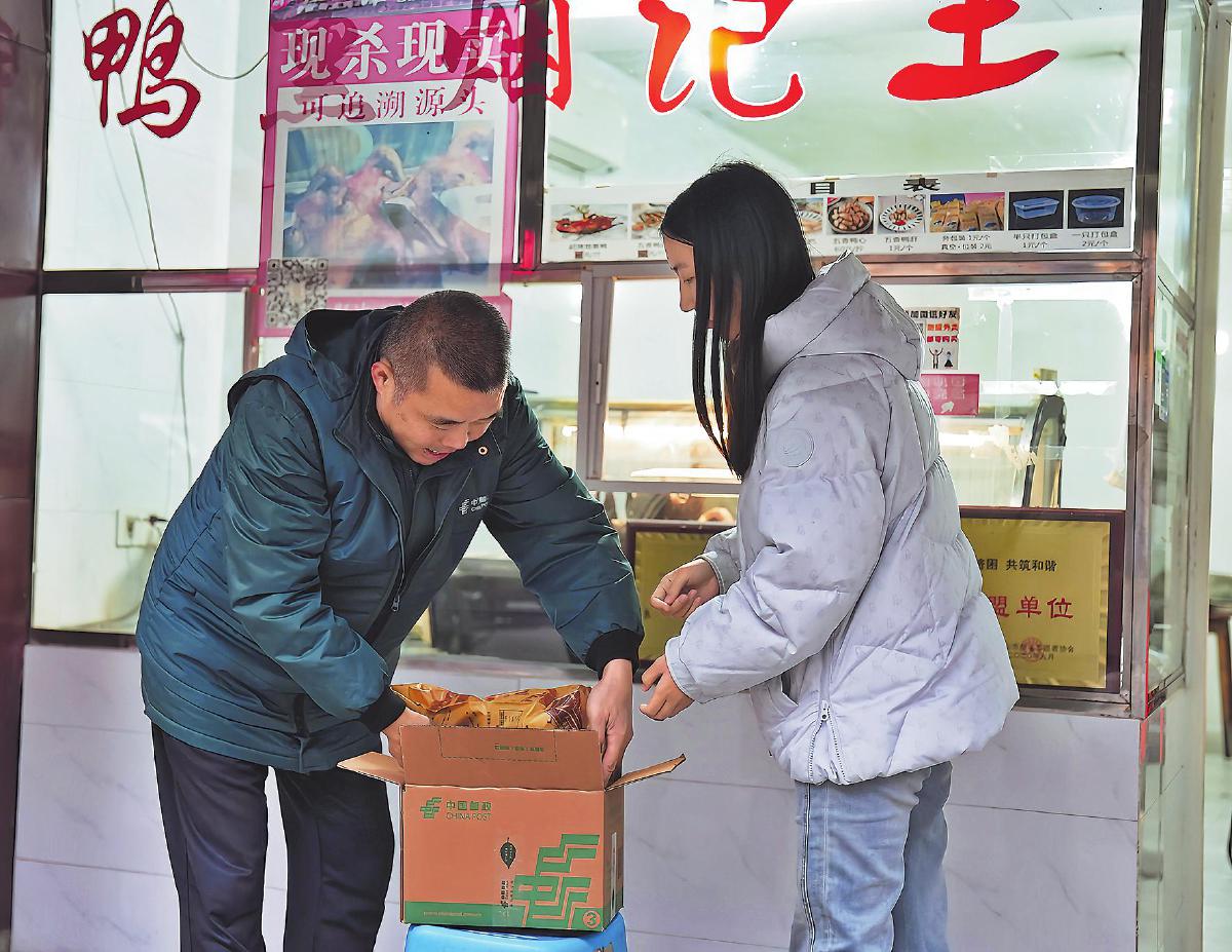 從街頭攤位到熱門景點(diǎn),春節(jié)期間,這樣的服務(wù)場景在樂山已成常態(tài)。在高鐵站附近的甜皮鴨店,拖著行李箱的游客在郵政工作人員的幫助下,爭分奪秒地填寫快遞單;峨眉山腳下的郵政網(wǎng)點(diǎn),穿著沖鋒衣的游客手提大包麻辣香腸、臘肉,排隊(duì)等候封箱郵寄;烏尤寺祈福的香客也會順道購買寺院門口的特產(chǎn)禮盒,郵寄給遠(yuǎn)方的親友。“在樂山,我們走到哪兒買到哪兒再寄出去,再也不用提著大包小包的行李趕路,這趟旅行真‘巴適’!”看著郵政小哥將甜皮鴨封裝完畢、貼上面單,趙女士高興地說。
