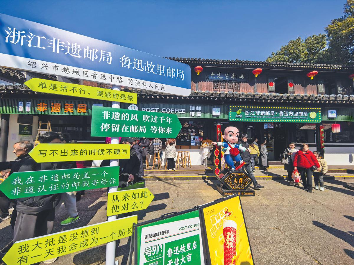 春節(jié)已過(guò),年味仍濃。2025年的首個(gè)“非遺春節(jié)”帶火了“新中式旅游”,也掀起了古韻名城紹興的旅游熱潮。春節(jié)假期,位于浙江省紹興市的魯迅故里景區(qū)游人如織。在景區(qū)大門(mén)口的戴家臺(tái)門(mén),一座融合了非遺與百年郵政底蘊(yùn)的非遺郵局,成為游客爭(zhēng)相打卡的熱門(mén)景點(diǎn)。