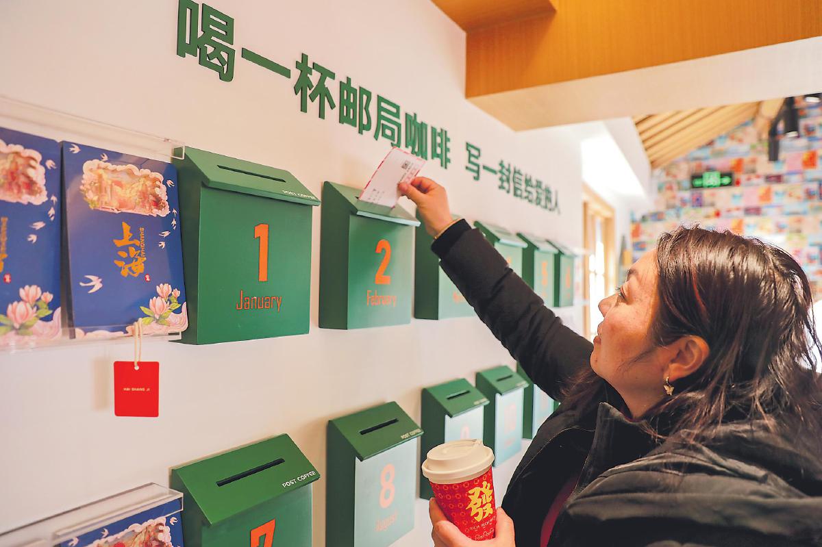 春節(jié)期間,位于上海七寶古鎮(zhèn)的七寶咖啡郵局引來眾多游客打卡。該郵局將咖啡文化、古鎮(zhèn)文化與郵政文化相結合,市民和游客在享用咖啡、感受古鎮(zhèn)魅力的同時,還能制作個性化明信片,加蓋紀念章和郵政日戳,把美好的祝福郵寄給親朋好友。