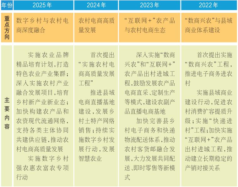 2月23日,2025年中央一號(hào)文件正式對外發(fā)布。這是黨的十八大以來,中央連續(xù)發(fā)出的第13個(gè)指導(dǎo)“三農(nóng)”工作的一號(hào)文件。近年中央一號(hào)文件及相關(guān)政策顯示,農(nóng)村電商已成為推動(dòng)鄉(xiāng)村振興和實(shí)現(xiàn)農(nóng)業(yè)現(xiàn)代化的重要抓手,政策導(dǎo)向逐步深化,覆蓋基礎(chǔ)設(shè)施建設(shè)、產(chǎn)業(yè)融合、數(shù)字化升級等多個(gè)維度,從銷售到全產(chǎn)業(yè)鏈整合,從科技賦能到產(chǎn)業(yè)創(chuàng)新,從一二三產(chǎn)業(yè)融合到生態(tài)體系建設(shè),持續(xù)為推進(jìn)農(nóng)業(yè)現(xiàn)代化和鄉(xiāng)村全面振興提供強(qiáng)大的活力與動(dòng)力。