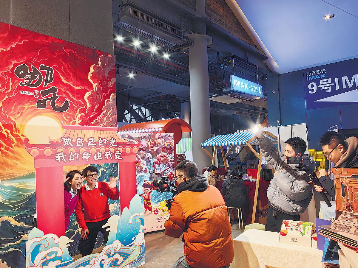 游客紛紛在“哪吒”主題墻前打卡?!鯒畋鶟崱z