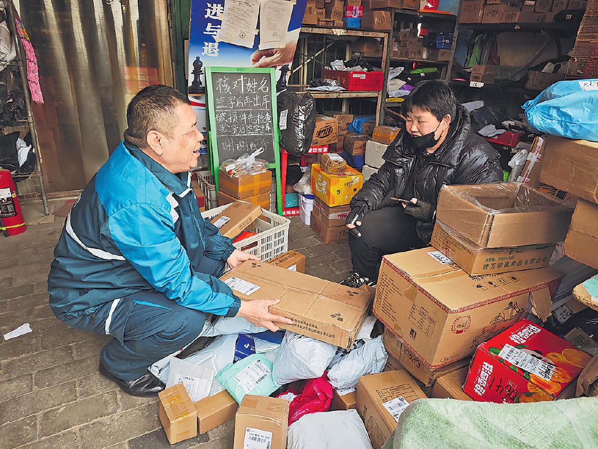 全國(guó)人大代表、河北省邢臺(tái)市郵政分公司城區(qū)寄遞事業(yè)部鄉(xiāng)郵員郭紅崗向投遞道段上的客戶講述全國(guó)兩會(huì)的盛況,傳遞黨的聲音?! 醭题暋O延兵 攝