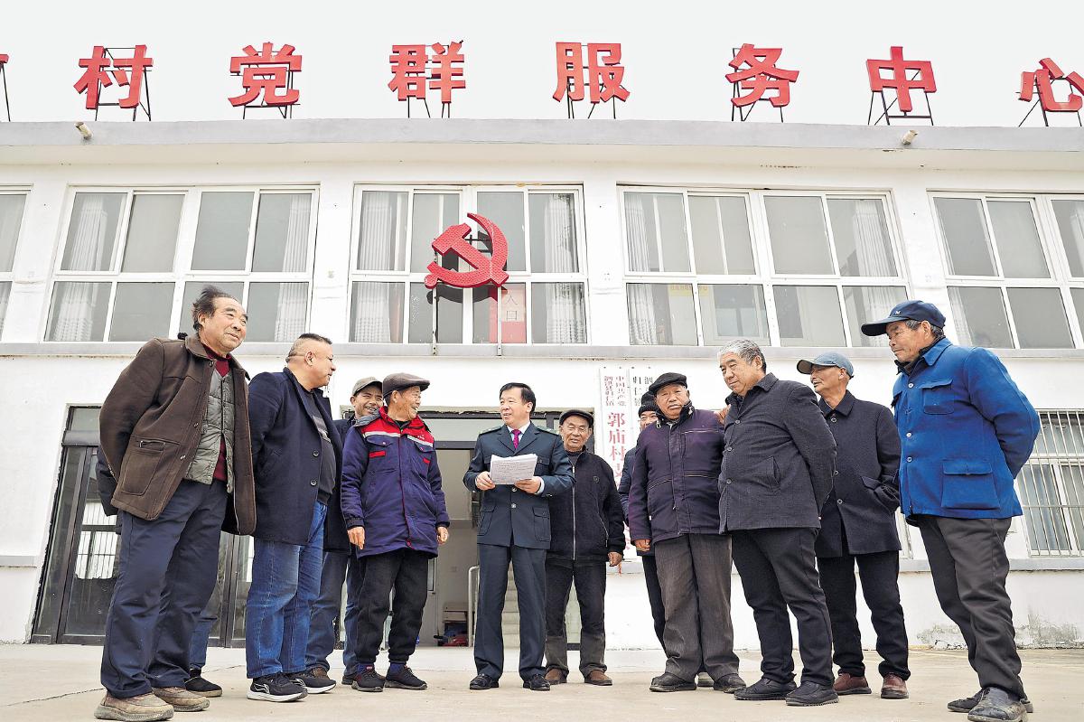 全國(guó)人大代表、江蘇省宿遷市泗洪縣郵政分公司歸仁支局局長(zhǎng)殷勇向當(dāng)?shù)厝罕娦v全國(guó)兩會(huì)精神?! 醢貫I豐 張成 攝