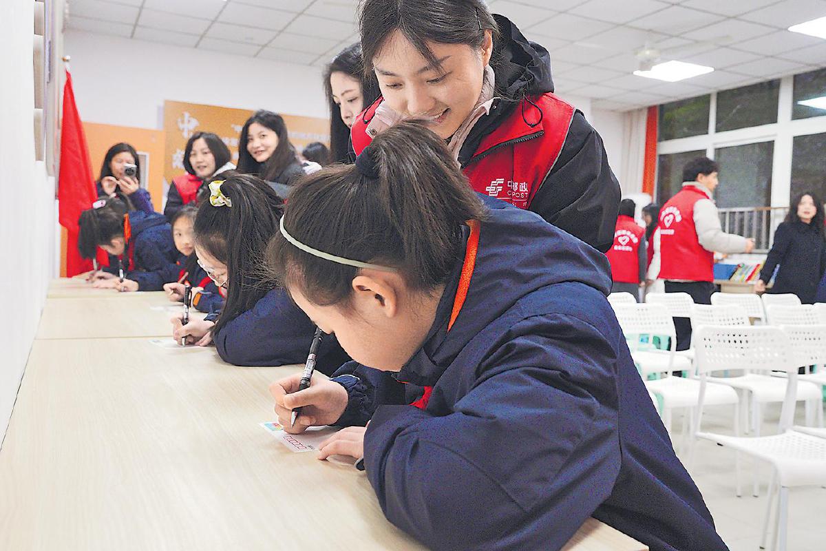 少年郵局內(nèi),重慶郵政青年志愿者指導(dǎo)小朋友書寫明信片。