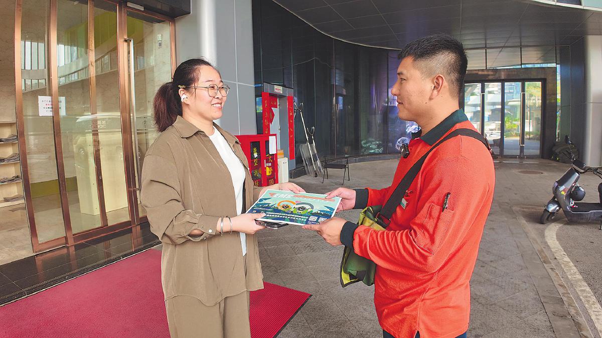 圖為投遞員將消博會(huì)證件郵件送交海口客戶馬女士。