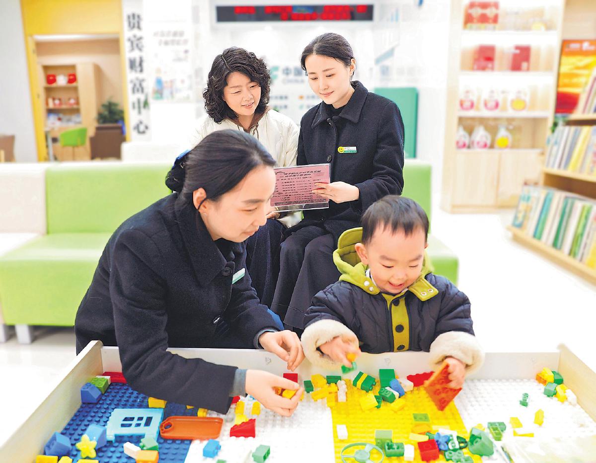 “奶奶您看,我搭的消防車(chē)?!奔稳鸫蟮类]政所內(nèi),一個(gè)小男孩正舉著積木興奮地向湯女士展示。在網(wǎng)點(diǎn)廳堂右側(cè)的等候區(qū),這樣的場(chǎng)景每天都在上演。玩具區(qū)內(nèi)堆滿(mǎn)樂(lè)高積木、繪本架上整齊排列著適齡讀物、小桌子上擺放著彩色蠟筆——這個(gè)占據(jù)網(wǎng)點(diǎn)30%空間的“童心驛站”,是有娃家庭辦理業(yè)務(wù)時(shí)的“打卡地”。