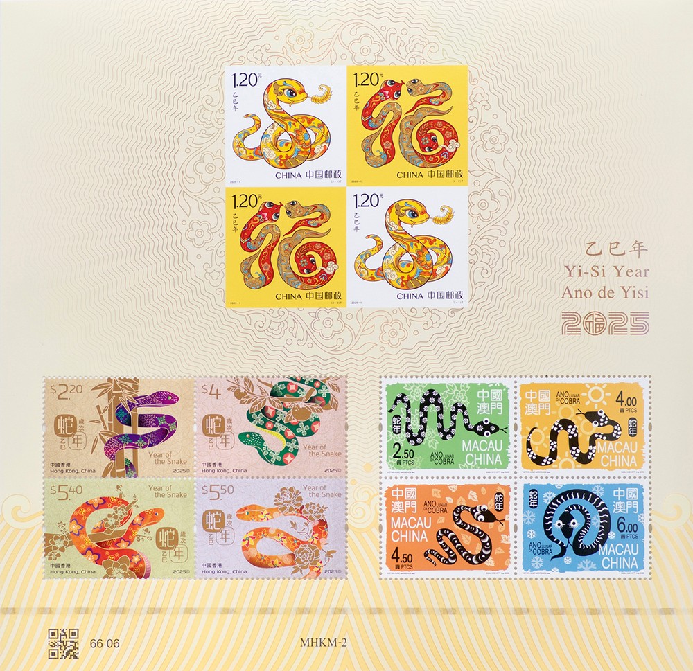 另與香港郵政、澳門郵電共同印制同題材三地小全張1枚,內(nèi)含中國郵政郵票4枚(2套,無齒孔),香港郵政、澳門郵電郵票各4枚。小全張編號:MHKM-2。成品規(guī)格:206×200毫米。版別:膠雕套印。印制廠:河南省郵電科技有限公司。郵折售價:人民幣52元。計劃發(fā)行數(shù)量:40.5萬枚(不含港澳地區(qū))。