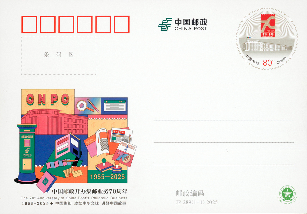 中國郵政定于2025年1月10日發(fā)行《中國郵政開辦集郵業(yè)務70周年》紀念郵資明信片1套1枚。詳情如下: