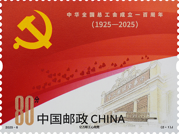 中國(guó)郵政定于2025年5月1日發(fā)行《中華全國(guó)總工會(huì)成立一百周年》紀(jì)念郵票1套2枚,郵票圖案名稱為:億萬(wàn)職工心向黨、團(tuán)結(jié)奮斗新征程。全套郵票面值2.00元,計(jì)劃發(fā)行數(shù)量570萬(wàn)套。